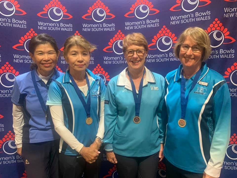 The team of Elizabeth Blackwell (Neutral Bay), Diane McBryde (St Ives), Midori Matsuoka (Neutral Bay) and Patricia Tan (Belrose) were “daily winners” in their Section on two of the three days of sectional play. (On the first day, their winning scores were 35-5 and 25-9 which set the tone for the day two, when they won 36-8 and 19-12.) The third day started with another convincing win 29-10, then a draw in the final game saw them miss out on the daily prize by 4 shots. However, they easily took out the overall Section win to progress to the Post-Sectional rounds.