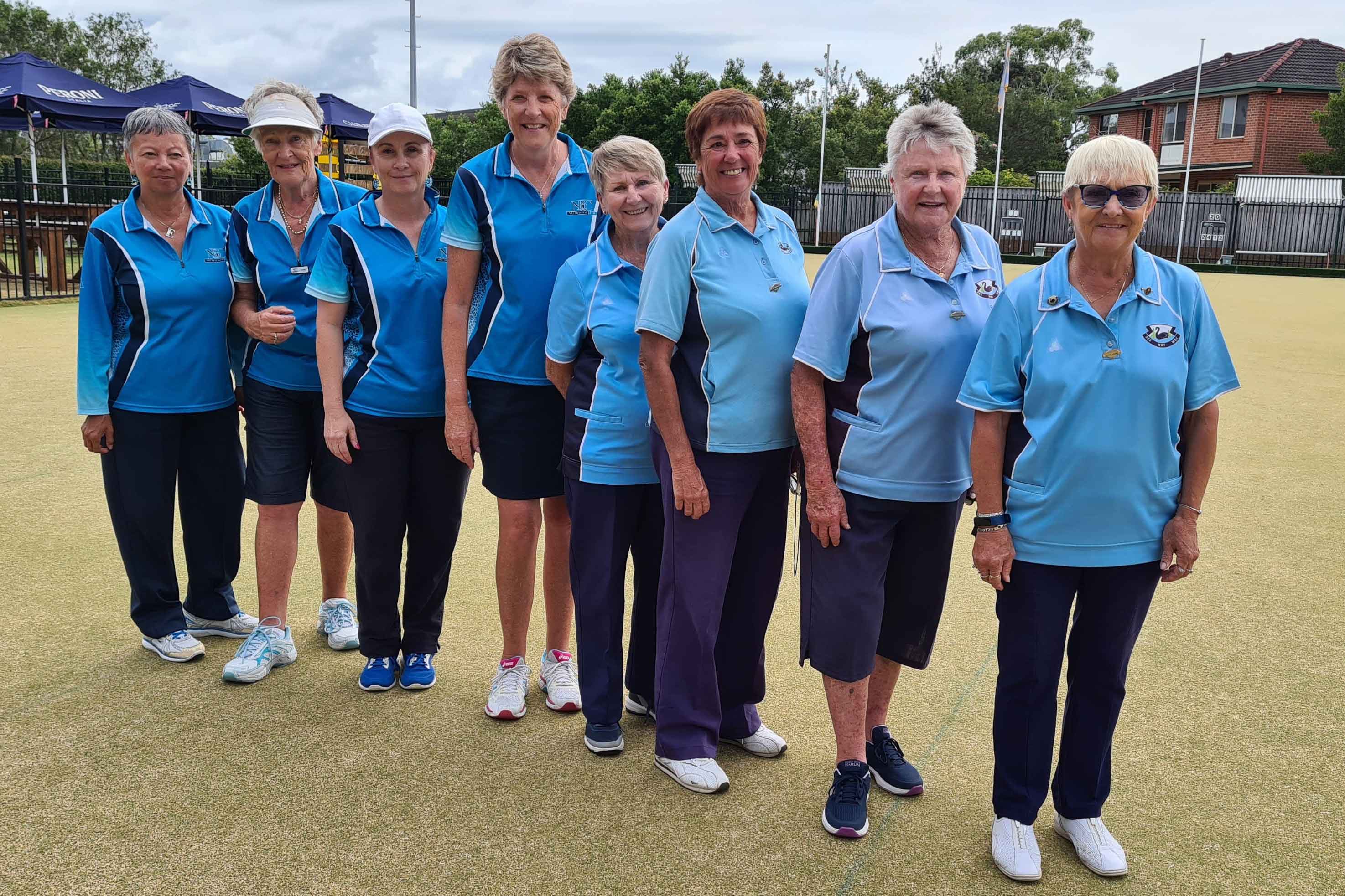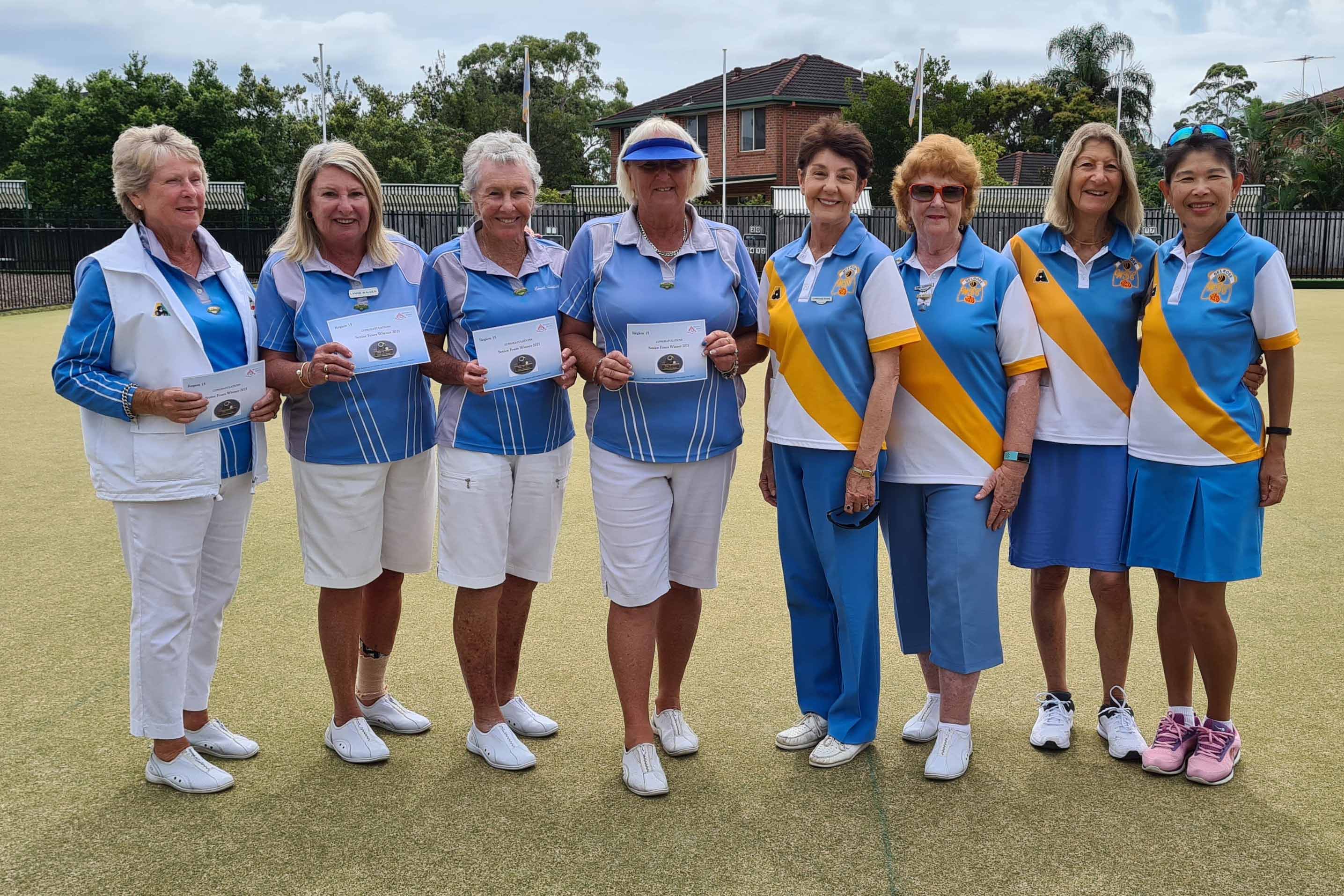 In the Senior Fours, the Belrose team of Lorraine Fevre, Kaye Alderton, Louise Hamshere and Patricia Tan were evenly matched at first against the Newport Beach team of Lyn Walden, Marie Barry, Coral Lindley and Vicki Sawtell, with scores level at 2-2 after three ends and 7-7 after 10. When it looked as though Newport Beach was pulling away, a pair of two’s to Belrose saw them trail by only one shot after 15 ends 11-12, and remain in touch at 13-15 going into the last end. But with Belrose holding match, the Newport third dragged the jack back about 1.5 metres to be holding four. Despite Belrose skip Patricia’s efforts, she was unable to extract the jack from its position and Newport picked up 5 to take the match 20-13.