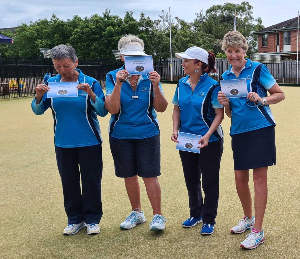 In the Open Fours, the Dee Why team of Jan Chad, Nannette Crawshay, Clare Turner and Sue McFadden were on the board first, leading 5-0 after the first three ends. But then the Neutral Bay team of Elaine Seidler, Jenny Palmer, Kate Wingrove and Jenny Hepburn picked up consecutive fours to take the lead 8-5. From that point onwards, Neutral Bay lead all the way: they picked up multiples and conceded only singles on their way to a 24-12 victory, and have booked themselves a spot in the State Championships.